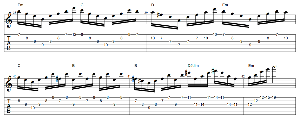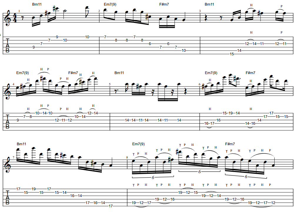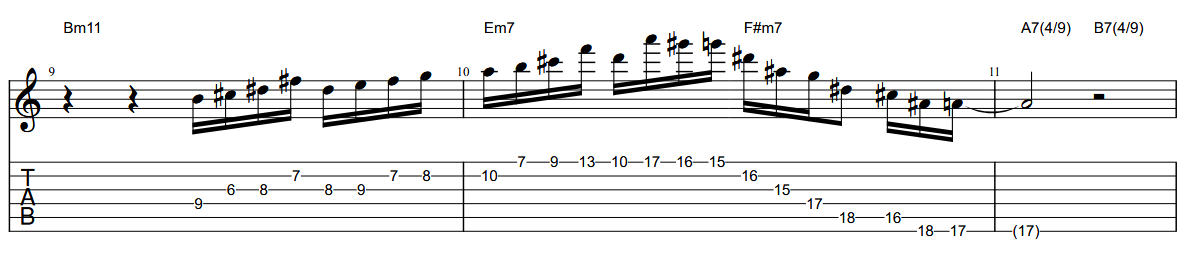 Here he steps slightly outside the key by briefly replacing the minor 3rd with a major 3rd, implying a dominant colour—essentially a Mixolydian ♭6 sound—over the Bm harmony. He then pushes the tension further with a “sinister” Eb7(#11) arpeggio over Em7, before landing cleanly on A as the line enters the bridge.