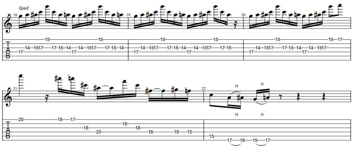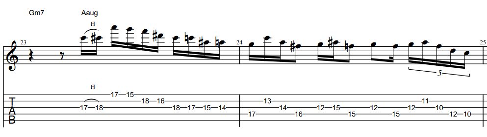 The lick here starts as a simple looping line over Gm9, but then he suddenly breaks away from the key and launches into an altered arpeggio—essentially another variation of an altered A7 sound, though with a few spontaneous notes thrown in. Pretty cool!